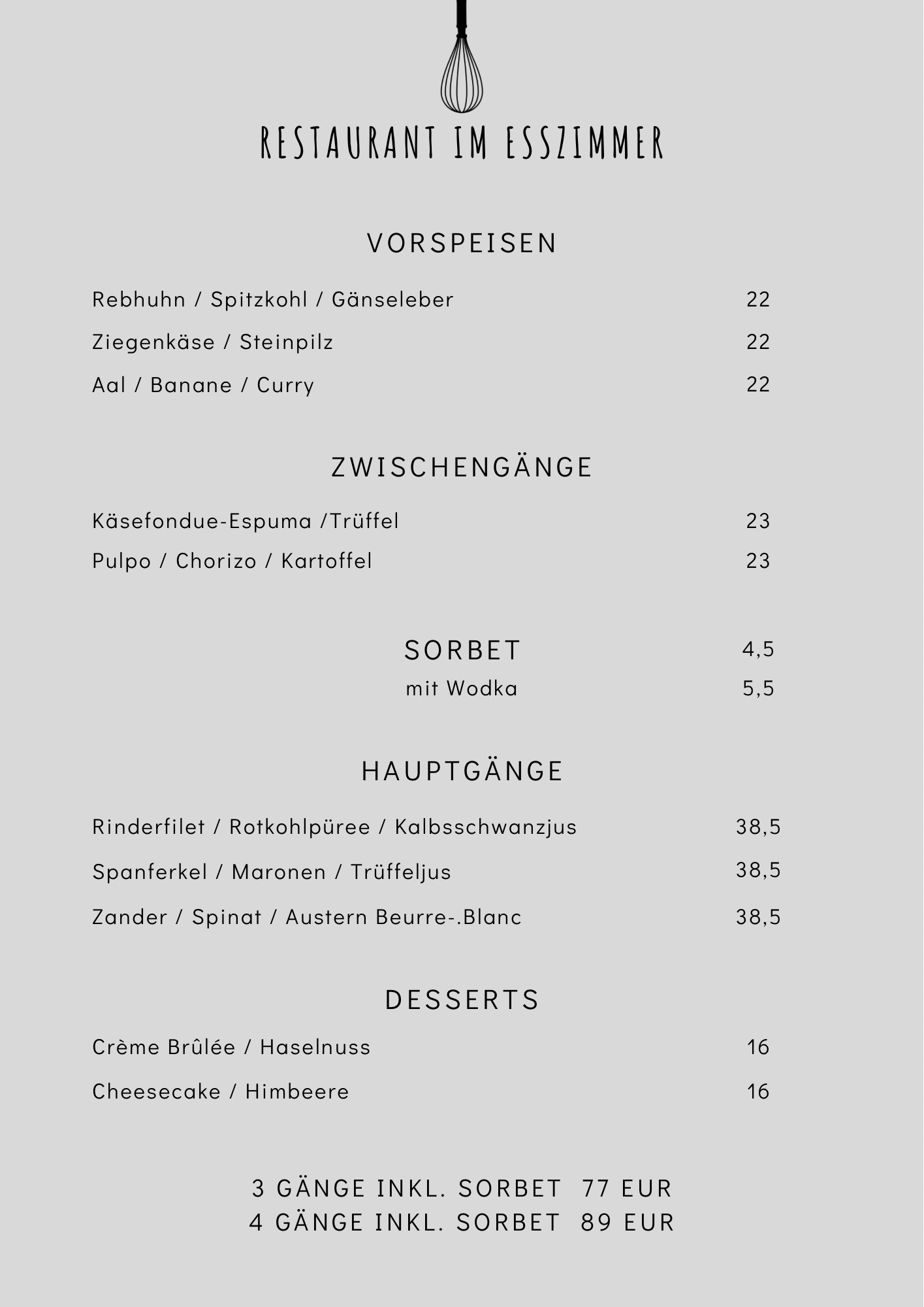 Dazu gibt es eine Auswahl an guten Weinen, die perfekt zu unserer Küche passen. Damit es spannend bleibt kreieren wir jeden Monat eine neue Speisekarte.